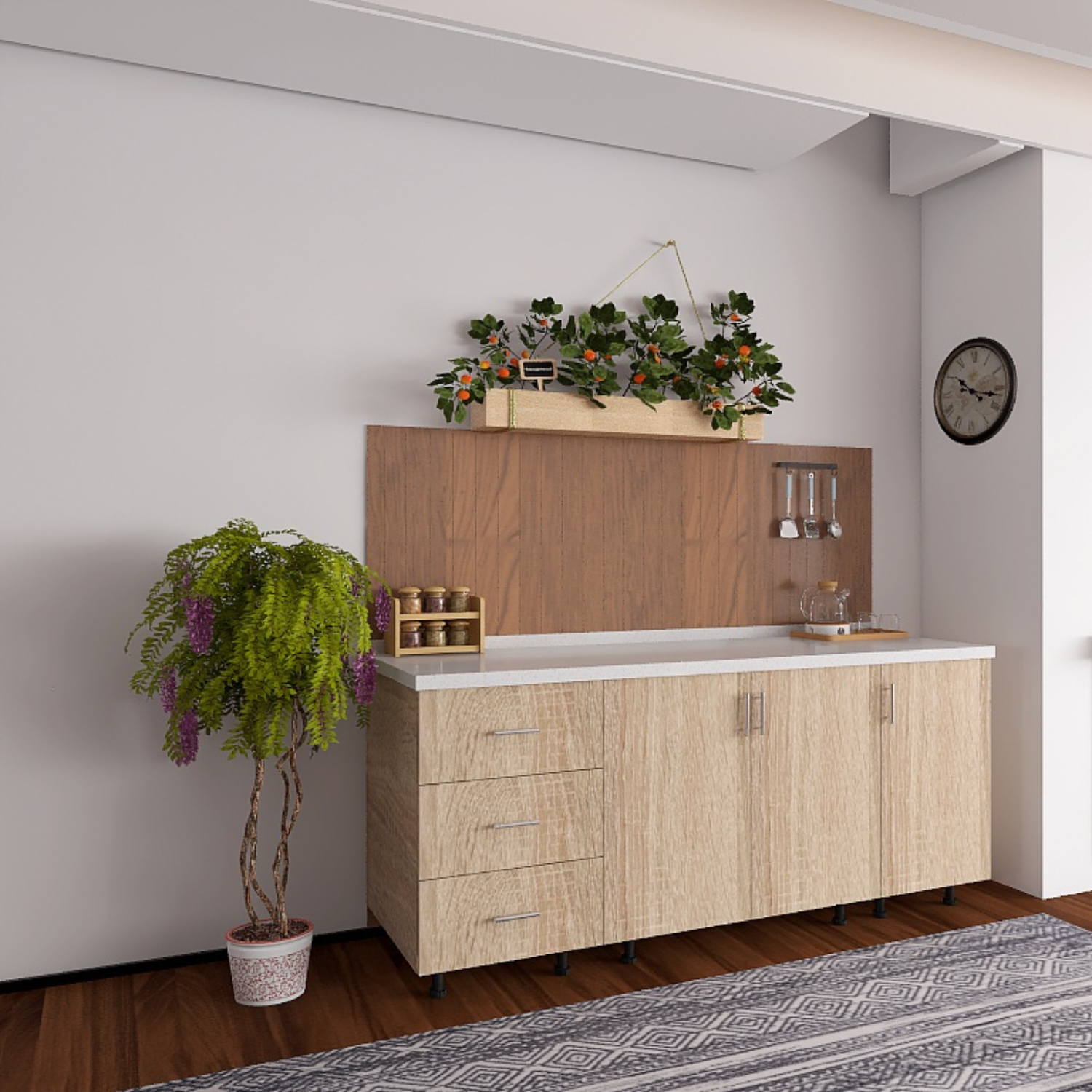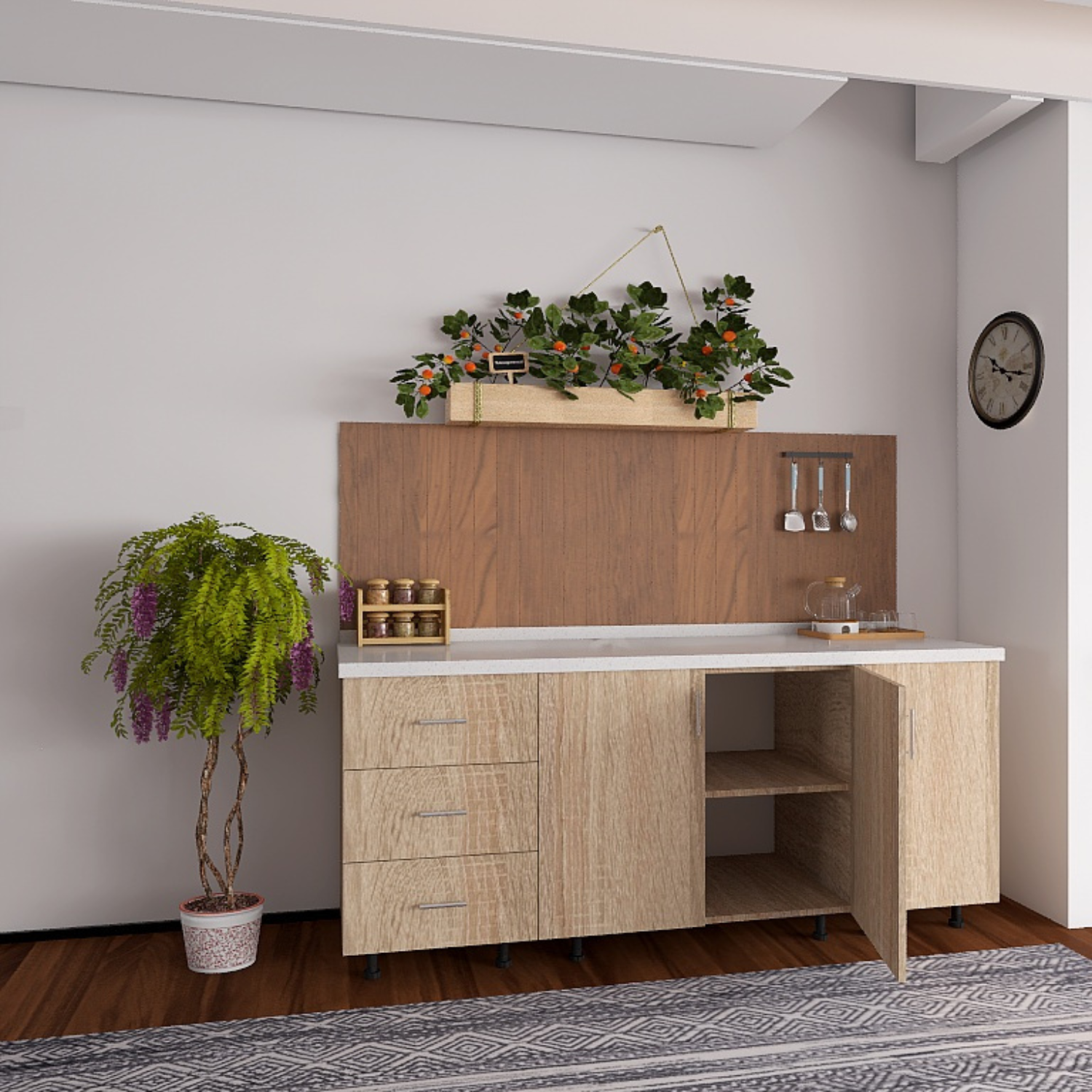 Fiecare corp este prevăzut cu picioare reglabile, ceea ce permite alinierea perfectă chiar și pe suprafețe denivelate. Manerele metalice cu finisaj cromat adaugă o notă contemporană și elegantă, completând perfect aspectul mobilierului.