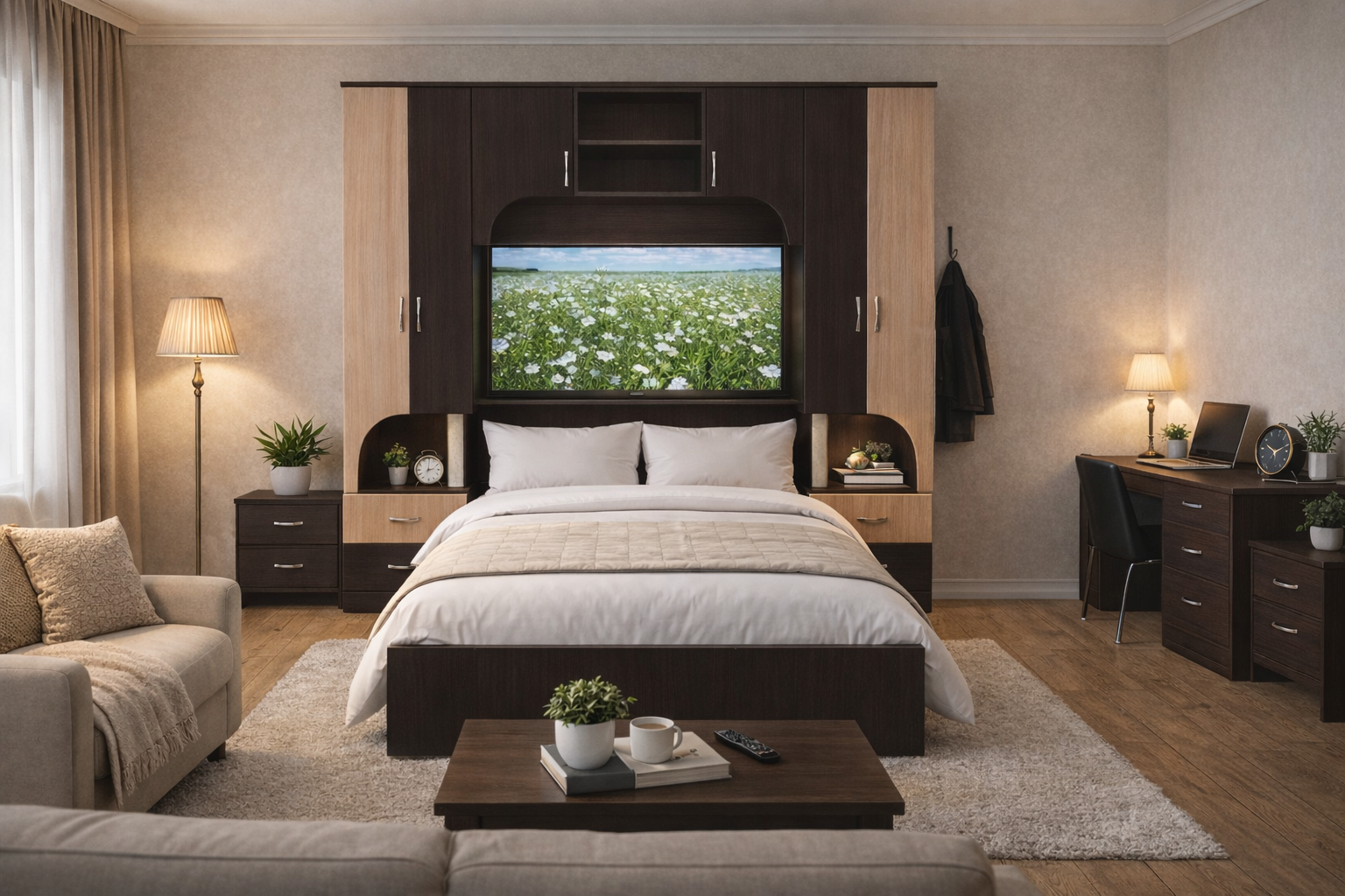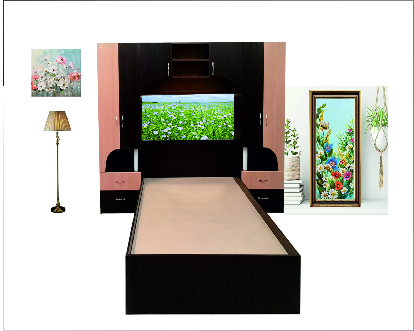 Camera de tineret Alex este potrivit pentru amenajarea dormitorului chiar si cand acesta are dimensiuni mici , oferind doua dulapuri fiecare cu cate doua sertare potrivite pentru depozitarea textilelor mici . Ficere dulap este prevazut in partea superioara cu spatii de depozitare astfel : cel din stanga are bara umeras pentru camasi si tricouri iar cel din dreapta are doua polite . Designul curbat al usilor da ata eleganta cat si utilitate spatiului cu rol de noptiera asigurand accesul liber la el .Deasupra sertarelor gasim un raft care joaca rol de noptiera putand accesa din pat diverse obiecte .Deasupra patului avem corpul suspendat potrivit atat pentru depozitare cat si pentru expunere .Acest dormitor este realizat din PAL melaminat de 18 mm , deci calitate premium si prezinta un finisaj stejar magia combinat cu fag . Aceaste nuante eleganta creeaza un ambient primitor si modern