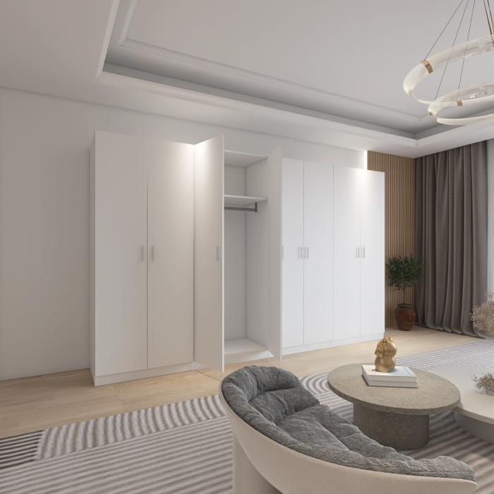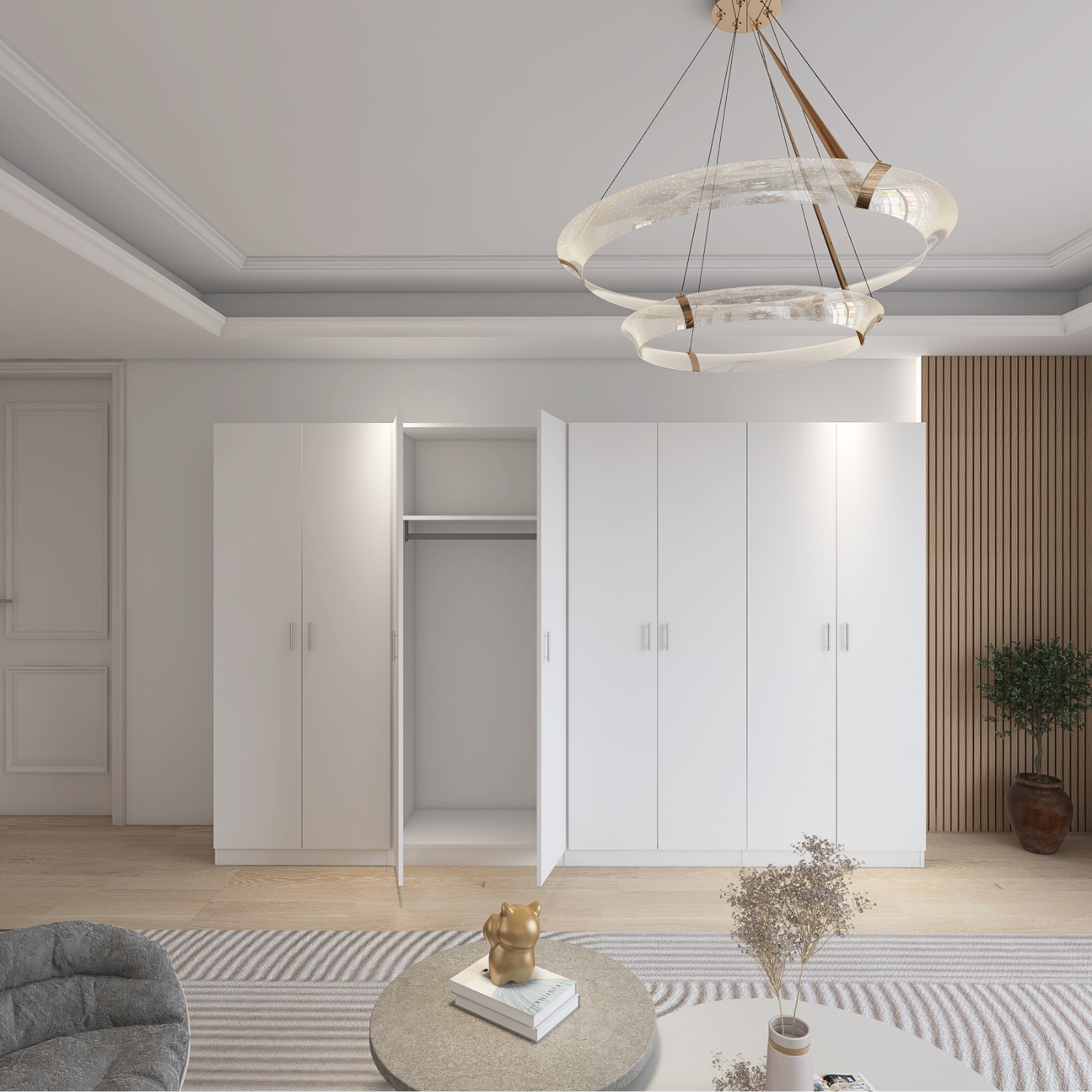 Organizează-ți eficient garderoba cu acest dulap spațios cu 8 uși cu rafturi si bara haine, ideal pentru dormitor, hol sau dressing. Fabricat din PAL melaminat de 18 mm, cu cant ABS rezistent, dulapul combină durabilitatea cu un design modern și curat.