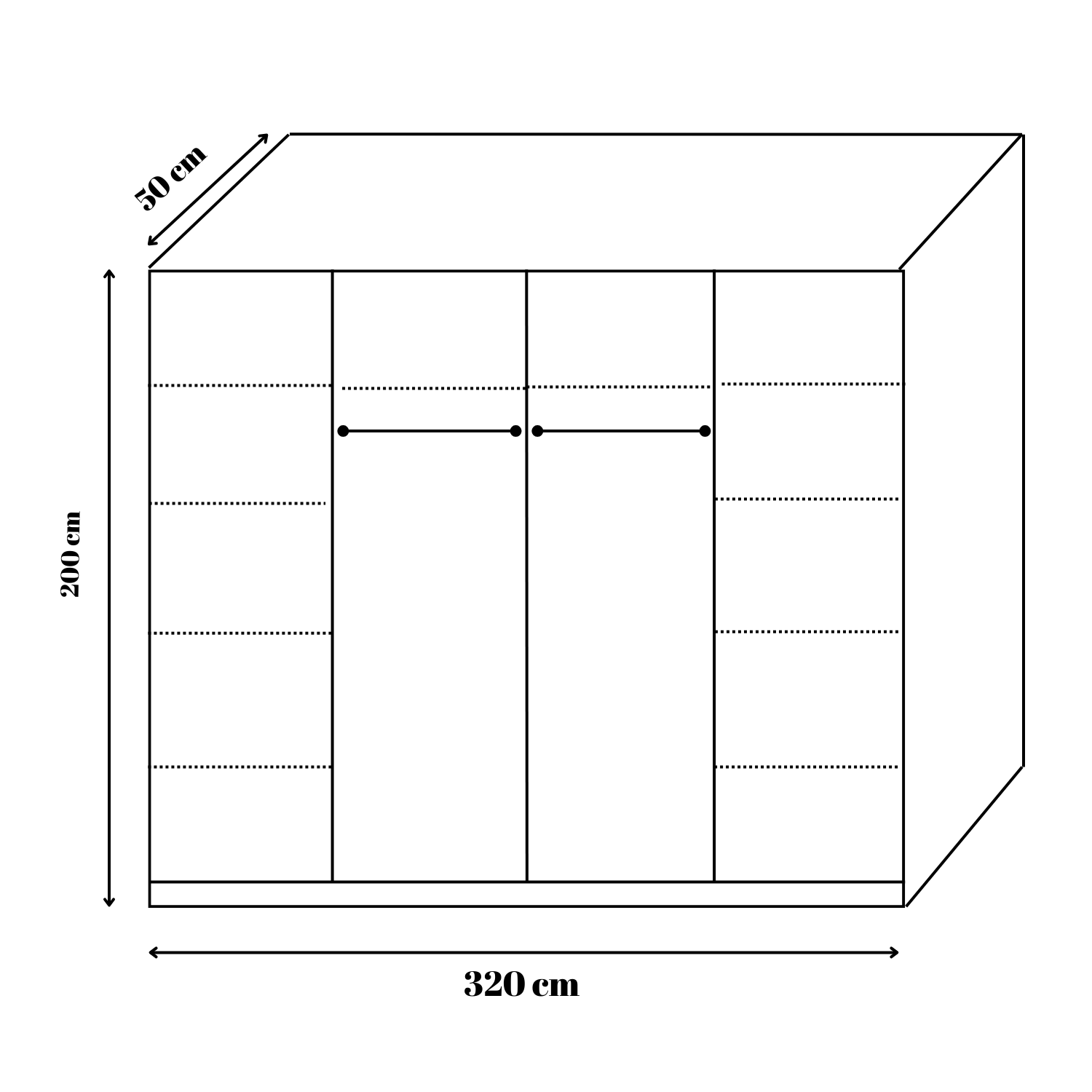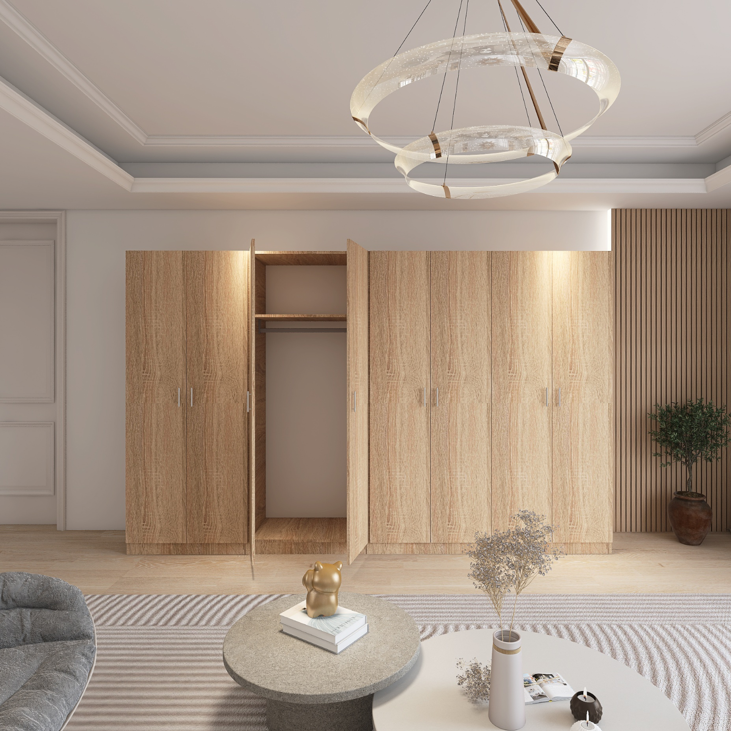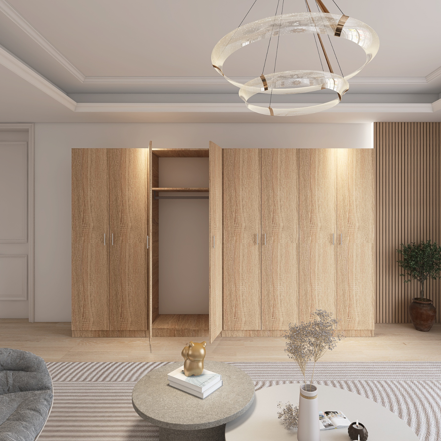 Organizează-ți eficient garderoba cu acest dulap spațios cu 8 uși cu rafturi si bara haine, ideal pentru dormitor, hol sau dressing. Fabricat din PAL melaminat de 18 mm, cu cant ABS rezistent, dulapul combină durabilitatea cu un design modern și curat.