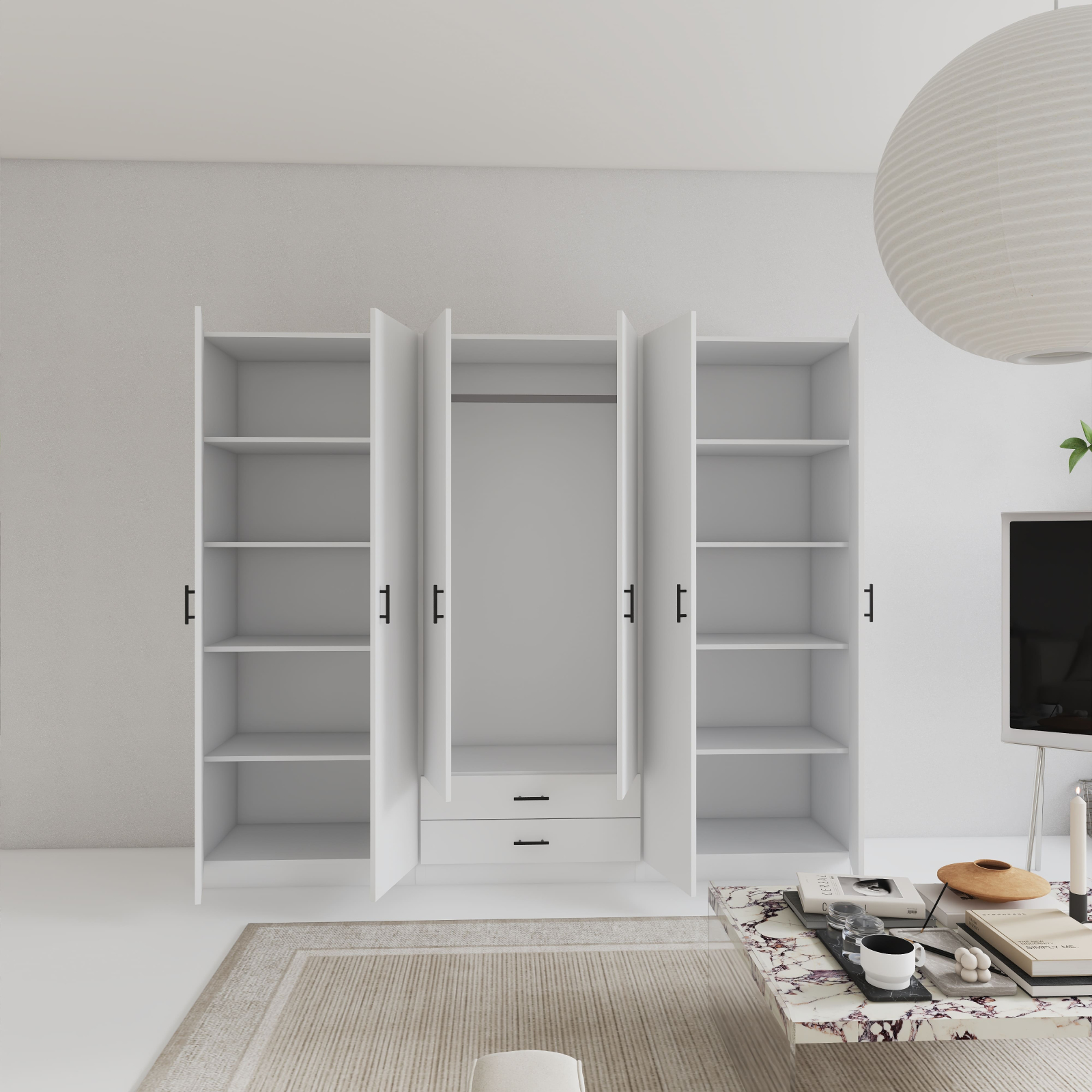 Dulapul cu 6 uși și rafturi este soluția ideală pentru a păstra ordinea și a valorifica eficient fiecare colț al locuinței sau biroului. Compartimentarea practică cu rafturi spațioase permite organizarea clară a hainelor, lenjeriei, cutiilor de depozitare, documentelor sau altor obiecte personale. Indiferent dacă îl folosești în dormitor, hol, birou sau dressing, acest dulap aduce ordine, funcționalitate și un aspect elegant.