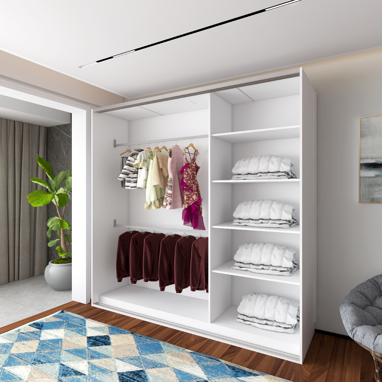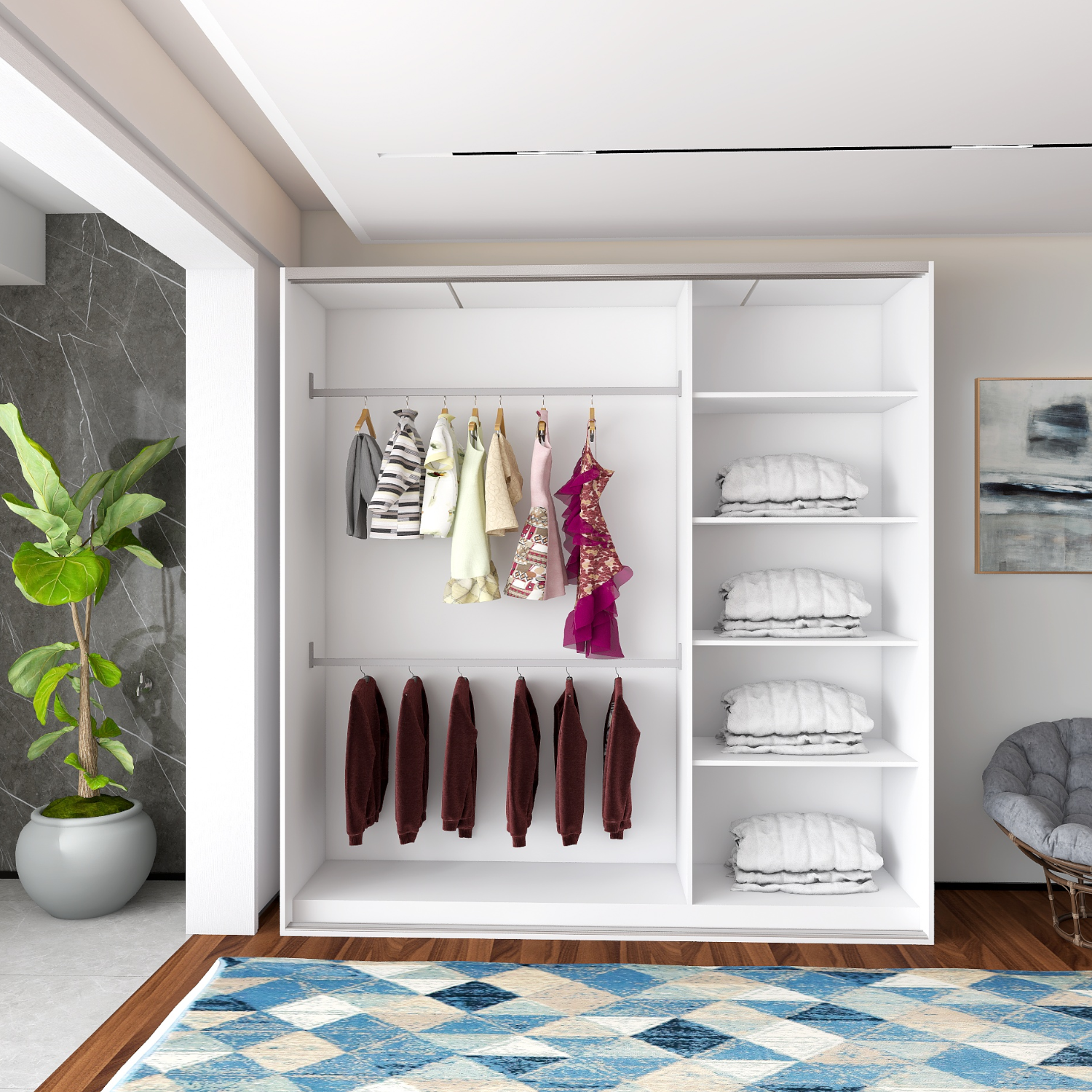 ✅ Bară metalică pentru umerașe – susține haine grele fără probleme